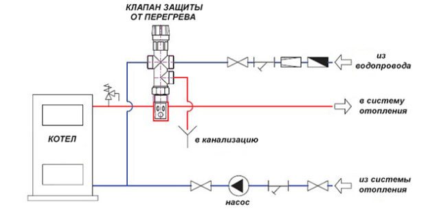 - la deuxième option prévoit la présence vanne d'arrêt... Si la température de l'eau atteint des valeurs critiques, la vanne ne lui permet pas de s'écouler dans les tuyaux. L'eau froide est fournie au système d'alimentation en chaleur à partir du système d'alimentation en eau et le liquide de refroidissement surchauffé est évacué dans l'égout. Certes, la pression de l'eau doit être suffisante et sa composition ne doit pas contenir une quantité accrue de sels, ce qui provoquerait la formation de tartre.