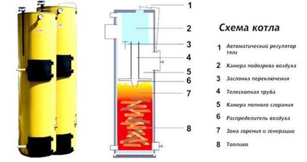 Les chaudières à pyrolyse (génératrices de gaz) sont un peu plus compliquées. Leur conception contient deux chambres de combustion... Le combustible solide (bois de chauffage) est mis dans le premier, à haute température et une carence en oxygène se produit processus de pyrolyse avec la libération de gaz de pyrolyse. Il entre dans la deuxième chambre, où il brûle et dégage de la chaleur vers le liquide de refroidissement. Seul le charbon de bois reste du bois de chauffage.