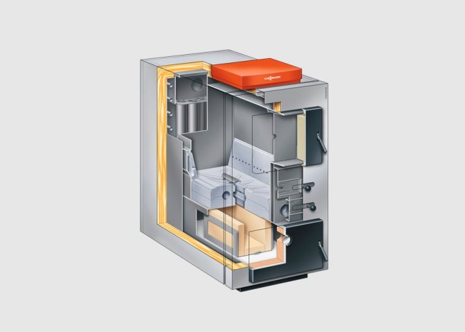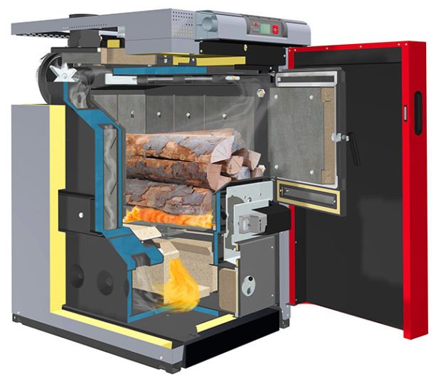 À foyer le combustible est fourni et brûlé pour obtenir de la chaleur. Ceci est la version classique. Il existe des chaudières à pyrolyse dans lesquelles le combustible solide (bois) brûle, libérant du gaz, qui brûle ensuite, fournissant de la chaleur. Dans le même temps, l'efficacité augmente quelque peu, mais nous traiterons plus tard des particularités du fonctionnement des chaudières classiques et à pyrolyse.