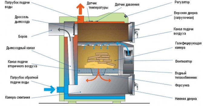 - volatile avec poussée supplémentaire... La conception prévoit un ventilateur qui permet à l'air de circuler dans la chambre de combustion. La plupart des chaudières à combustion longue, des chaudières à pellets et à pyrolyse sont produites dans cette conception. Certains paramètres peuvent être définis à l'aide du panneau de commande.