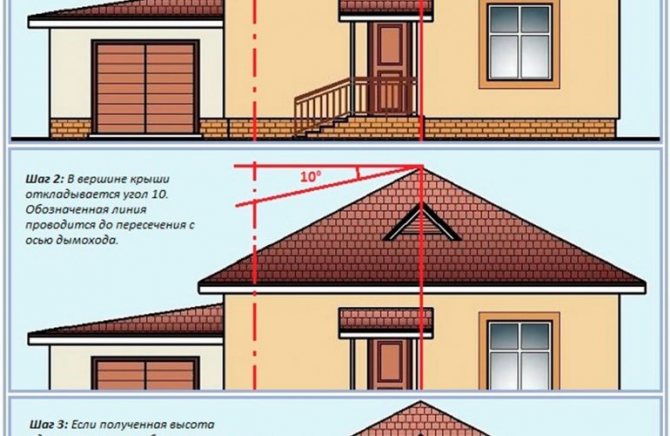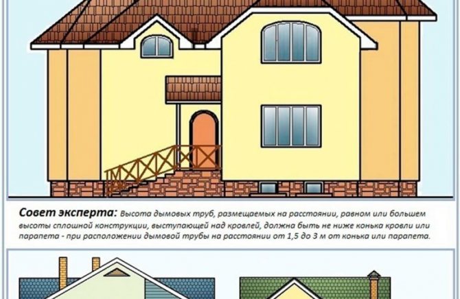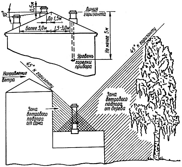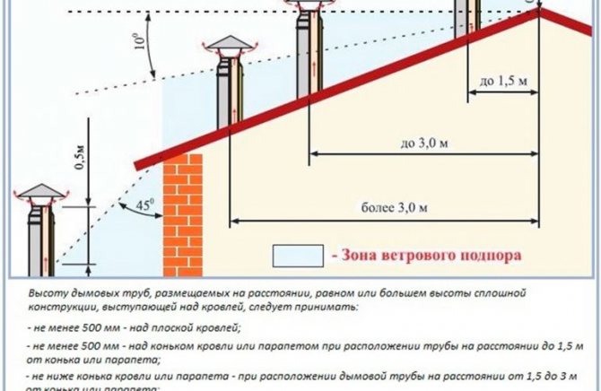 Le calcul de la hauteur du tuyau et son emplacement sont précisés dans SNiP. Ils disent: