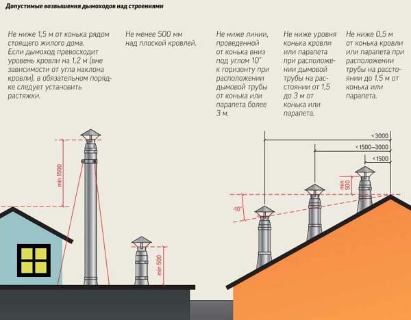Vous devez savoir que la hauteur de la cheminée au-dessus du toit doit être calculée en tenant compte des exigences de sécurité incendie. Il est interdit de placer la cheminée à côté des portes, fenêtres, puits de lumière, car les étincelles qui en sortent peuvent provoquer un incendie.