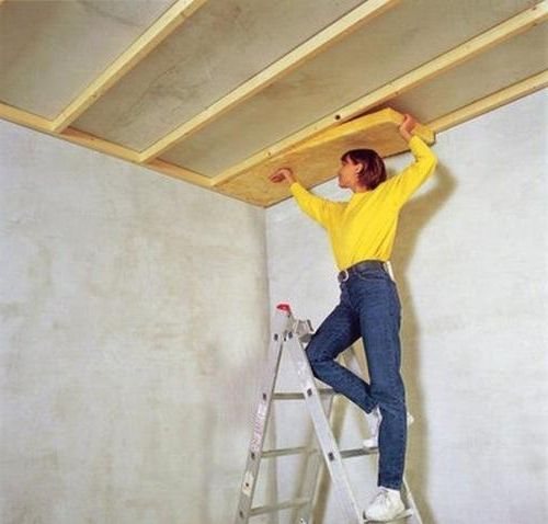- Pour effectuer l'installation, vous aurez besoin d'un support, qui peut être fait à l'aide d'éléments séparés ou d'un ourlet de plafond. Pour éviter l'utilisation de fixations inutiles, pour commencer, le plafond est gainé et, au fur et à mesure que les éléments sont fixés, les vides sont remplis de matière;