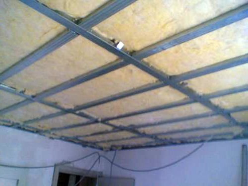 - Si les poutres sont généralement minces, une caisse est faite pour le faux plafond, après quoi le matériau est installé entre le profilé, puis la cloison sèche est fixée;