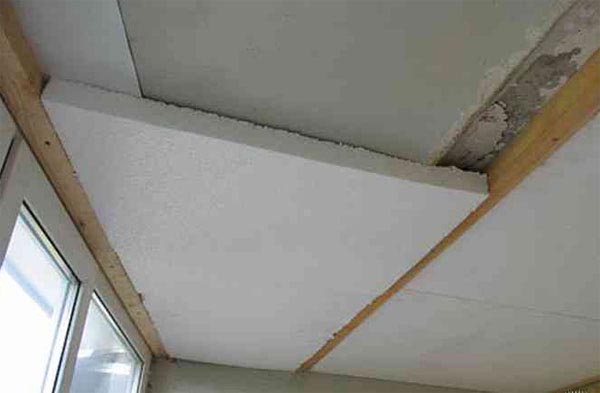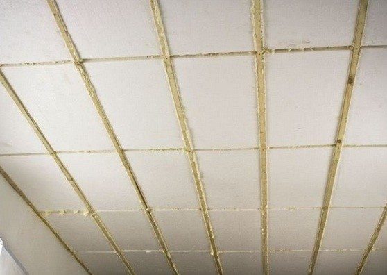 - Si aucune des méthodes ci-dessus ne vous convient, vous devrez utiliser de la mousse ou du penoplex. La fixation se fait ensuite avec de la colle à carrelage ou de la mousse adhésive. Le plafond est pré-apprêté. Après cela, le matériau est enduit de colle et appliqué sur le plan du revêtement. Après cela, des fixations supplémentaires doivent être effectuées à l'aide de champignons.