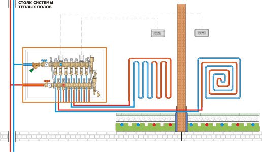 Le schéma montre comment connecter - le chauffage par le sol au chauffage dans les appartements qui ferment le circuit de chauffage. Si le raccordement est effectué dans les appartements du milieu, la vanne à trois voies est remplacée par une vanne à deux voies.
