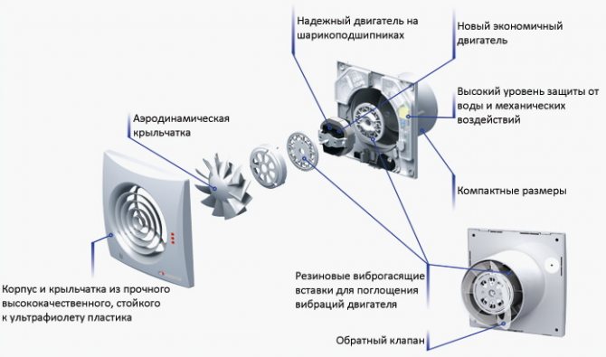 En plus du clapet anti-retour, le ventilateur silencieux se compose des éléments suivants: grille d'admission d'air, roue aérodynamique, inserts amortisseurs de vibrations et un moteur.