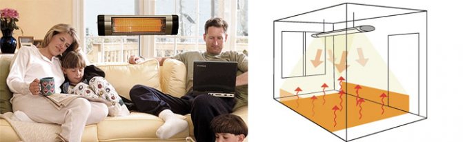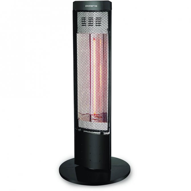 Le flux de rayonnement infrarouge d'une lampe, le plus souvent situé horizontalement dans le boîtier, ne chauffe pas l'air sur son trajet, mais les objets qu'il atteint. Dans ce cas, non seulement leur chauffage de surface se produit, mais également un chauffage interne, à la suite duquel l'objet chauffé commence à dégager un excès de chaleur dans l'environnement.Ainsi, la pièce se réchauffe uniformément, sans le processus de convection de la source de chaleur et l'accumulation de poussière dessus. Le régulateur de puissance vous permet de régler la valeur souhaitée et le faible poids de l'appareil vous permet de le déplacer selon vos besoins vers d'autres pièces et de l'utiliser à la fois pour le chauffage zonal (volumétrique, diffus) et local (axé sur le sujet).