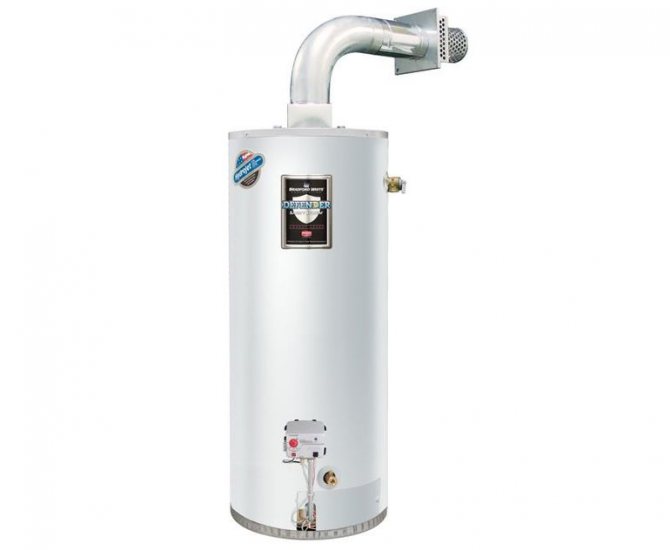 Il s'agit d'un type d'appareils à gaz, qui est un réservoir dans lequel l'eau est chauffée, puis se propage le long des conduites jusqu'aux points d'eau. L'eau dans le ballon est constamment chaude, et pas au moment où le robinet d'ECS est ouvert, comme lors de l'utilisation d'un générateur de chaleur à circulation. La colonne sans fumée fonctionne selon le principe suivant: lorsque la température dans le réservoir baisse, le capteur de température envoie un signal au brûleur pour qu'il s'allume. Pendant le fonctionnement du brûleur, de l'air chaud pénètre dans le tube de flamme entouré d'eau et y transfère de la chaleur. Dès que l'eau chauffe jusqu'au mode réglé, le brûleur s'éteint.