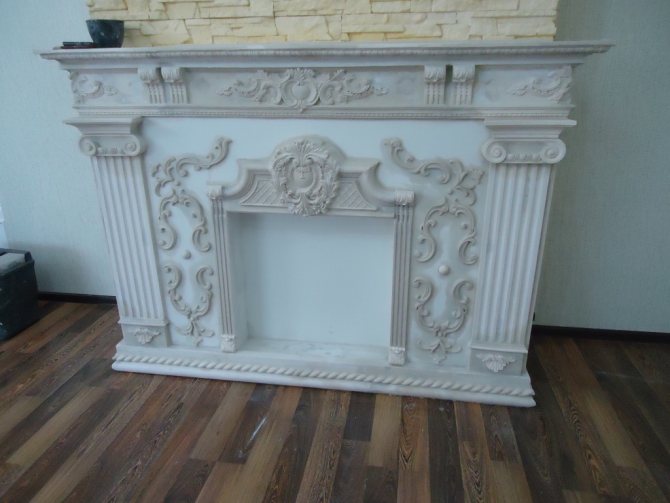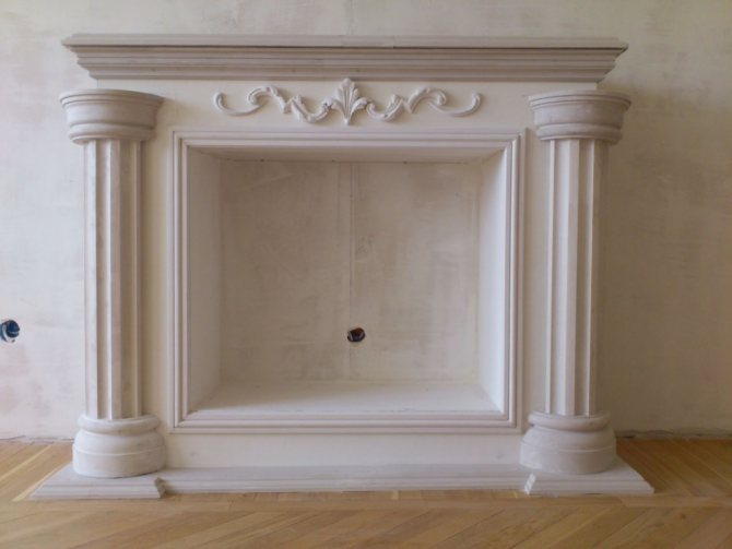 Moulure en plâtre pour la cheminée: encadrement classique, pour l'installation ultérieure d'un foyer électrique