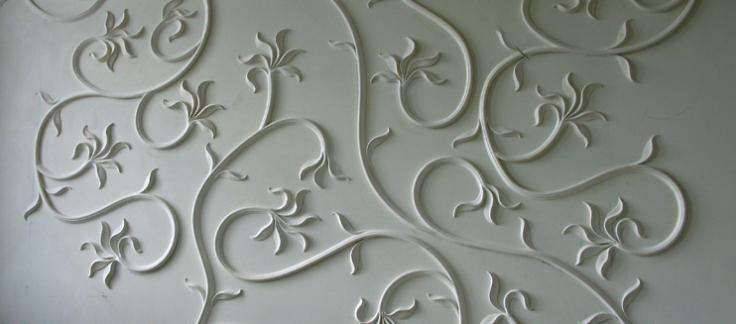 Les motifs, les dépressions et les collines sont formés selon les dessins appliqués, le mélange restant est éliminé. Une fois le plâtre complètement sec, les motifs sont poncés avec du papier de verre.