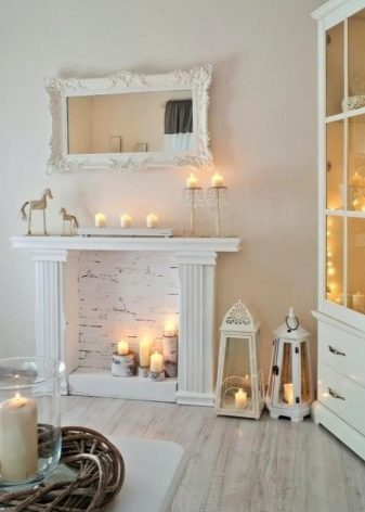 Les bougies peuvent être utilisées pour donner au portail la chaleur du feu vivant. Une fausse cheminée ainsi décorée deviendra un élément inoubliable d'une soirée romantique - les chandeliers reflétant de la cheminée ne laisseront personne indifférent.