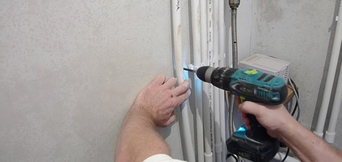 La prochaine étape est l'installation des points de fixation. Selon les marquages appliqués, le mur est percé aux bons endroits, formant des trous du diamètre correspondant dans la quantité prévue par les supports. Ensuite, ils sont équipés de chevilles en plastique.