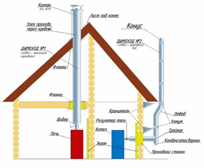 Les règles de sécurité incendie lors de l'installation d'une cheminée prescrivent le respect de certaines normes. Pour le câblage d'un tuyau sandwich à travers des structures en bois, une isolation thermique de haute qualité des pièces métalliques en bois (ou tout autre combustible) est nécessaire.