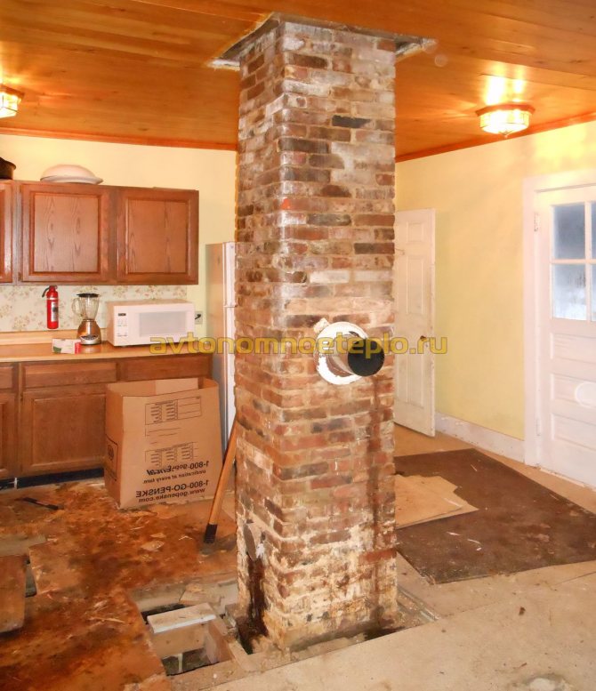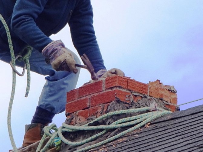 Tout d'abord, il est nécessaire de démonter la partie de la cheminée en brique devenue inutilisable. Le point clé de cette opération n'est pas la méthode - la maçonnerie est cassée de la manière habituelle, mais la sécurité. Il est nécessaire de s'assurer que les briques qui tombent ne blessent aucune des personnes qui se trouvent en dessous et ne percent pas le toit.