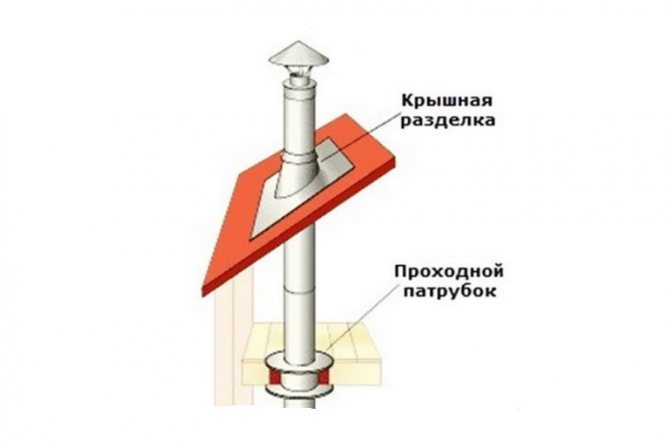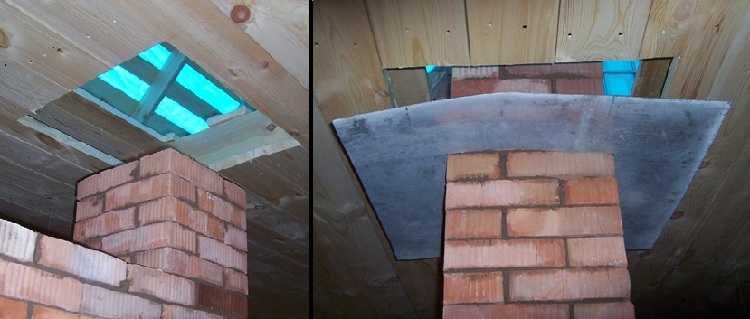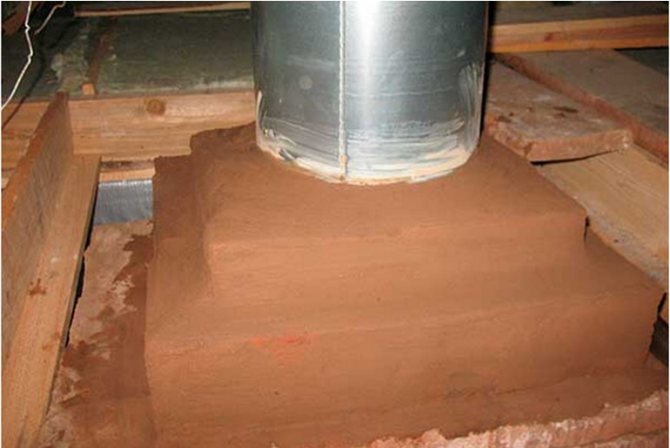 Il faut savoir que le bois peut s'enflammer à chauffage constant à 170 ° C. À cet égard, le respect des normes de sécurité incendie revêt une importance particulière. Dans les passages à travers le plafond et le toit, une découpe est effectuée - pose d'une couche d'isolation thermique. La distance entre le tuyau intérieur et le bord du plafond dans le passage doit être d'au moins 38 cm.