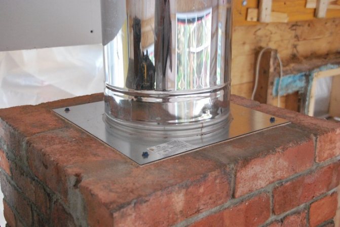 - Insérez la plate-forme de montage avec le tuyau de dérivation inférieur dans le canal de l'ancienne cheminée sur le mortier du four, fixez-la aux coins avec des chevilles aux briques.