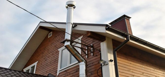 Tête avec une couverture de hanche près et sur le toit du manoir - Quelle que soit la forme du toit à pignon et l'éloignement du dispositif de cheminée du bord, la hotte doit être au moins un demi-mètre plus haute que son plan.