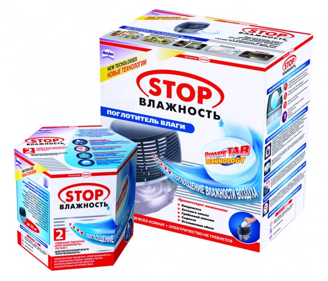 Des comprimés absorbants spéciaux (Ceresit "Stop Moisture", Henkel "Stop Moisture") sont utilisés avec un dessiccant - un récipient dans lequel s'écoule la solution saline formée à partir de l'humidité absorbée. Un tel dispositif est capable d'absorber environ 0,4 litre d'eau par mois. Dans ce cas, la superficie de la pièce ne doit pas excéder 20 m2. m. Un comprimé suffit pour deux à trois mois d'utilisation.