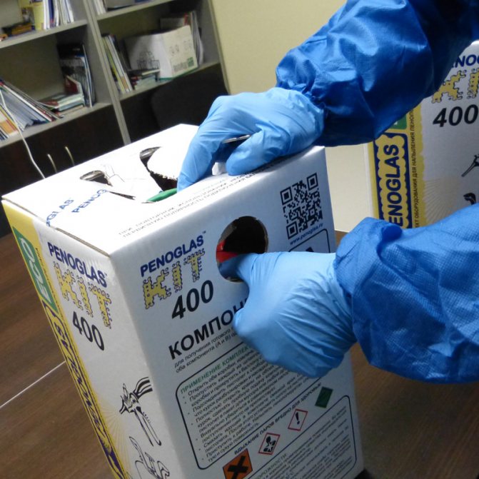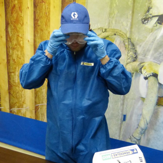 Habituellement, seuls les tuyaux sont tirés dans ou autour de la maison, à travers lesquels les composants pour la formation de mousse sont introduits dans le pistolet. C'est confortable. Les travailleurs qui pulvérisent de l'isolant thermique portent des combinaisons de protection, un respirateur, des gants et des lunettes. Un respirateur est nécessaire, car avant le durcissement, les composants de la mousse sont toxiques, et tout le reste est de protéger la peau de la pénétration de mousse de polyuréthane, qui ne peut alors pas être décollée.