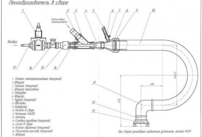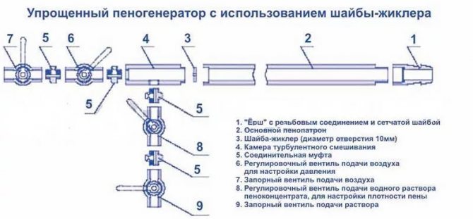 L'appareil de préparation de mousse liquide peut être acheté prêt à l'emploi, mais il ne coûtera pas cher, jusqu'à 2,5 mille dollars. Vous pouvez assembler l'appareil de vos propres mains à partir de pièces appropriées. Le principe de fonctionnement de l'installation est assez simple.À l'aide d'une pompe hydraulique, les matières premières et un catalyseur - résine urée-formaldéhyde - sont introduits dans l'unité. Là, sous l'influence de l'air comprimé, ils se transforment en mousse et sous pression à travers un tuyau ils pénètrent dans la zone traitée. Les pièces pour l'assemblage d'une telle structure sont disponibles gratuitement et les dessins peuvent être trouvés sur des ressources spécialisées.