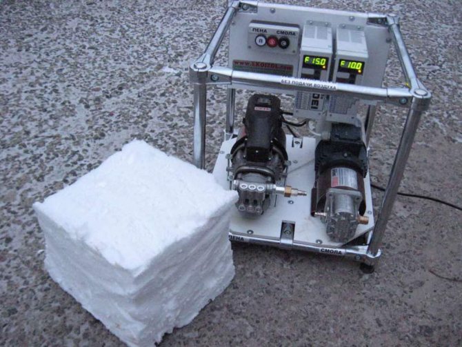 - Mousse industrielle. Pour le préparer, vous devez avoir une installation spéciale. Cela coûte très cher, donc presque personne ne l'achète à des fins domestiques. Mais pour réaliser des travaux d'isolation à l'échelle industrielle, on ne peut se passer d'une telle unité. Il prépare la mousse liquide directement dans le processus et l'alimente sur la surface de travail sous haute pression.