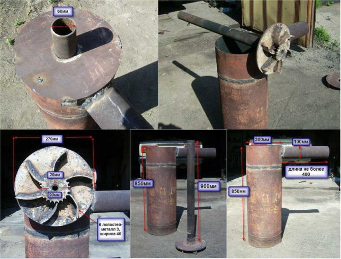 - Бутало. Състои се от пета с "ребра", към която е заварена тръба с диаметър 85-100 мм, за подаване на въздух в горивната камера. Благодарение на ребрата, петата не приляга плътно към горивото, което има положителен ефект върху процеса на горене;