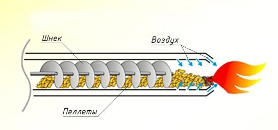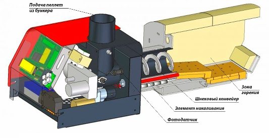 Процесът е следният: по команда на контролера шнекът подава малко количество пелети в камерата и спира. Подгревната свещ се включва и вентилаторът се включва едновременно, което води до запалване на горивото. Появата на стабилен пламък се фиксира от фотосензор и управляващият блок уведомява за това, а последният изключва светещия елемент. След това работата започва в нормален режим, конвейерът на шнека възобновява подаването и вентилаторът издухва необходимото количество въздух. По команда на същия контролер пелети се изсипват в горелката през дюзата, транспортирани там от зареждащия бункер от външен шнеков транспортьор.