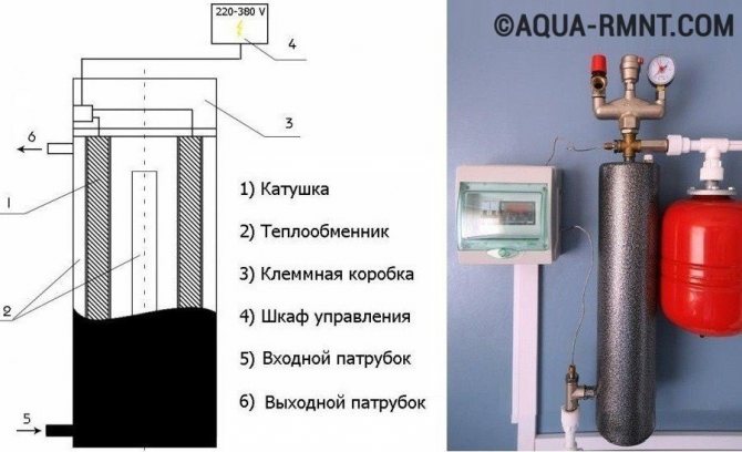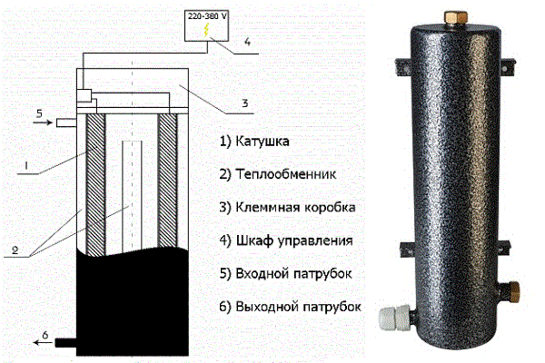Основата на принципа на работа на котела е създаването на топлинна енергия от електрическа енергия. Действието на електромагнитната индукция е следното - през бобина, увита в тел, пропускаме ток, около тази намотка възниква електромагнитно поле. Поставената в бобината метална сърцевина (която има свойството да се привлича от магнита) ще започне бързо да се нагрява.