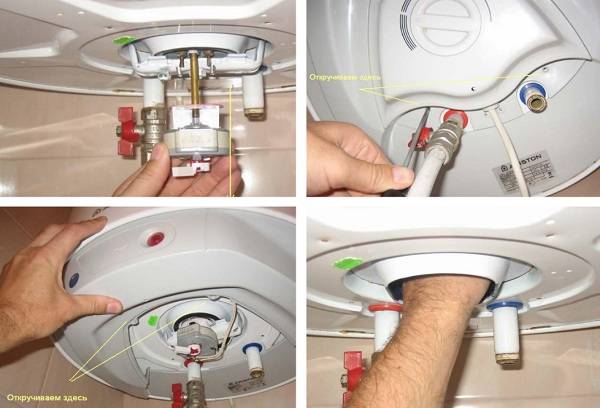 Ако нагревателният елемент е завинтен в резервоара, тогава източването ще бъде лесно. Но има някои модели, при които, преди да стигнете до етапа на източване на течността, ще трябва да развиете няколко гайки.