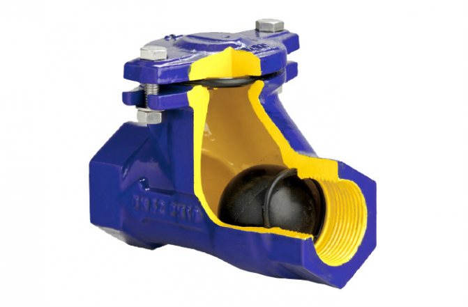 Основата на дизайна е чугунена или алуминиева топка, покрита със слой каучук, който, когато охлаждащата течност се движи директно, се избутва в горната част на тялото, в специална ниша.В случай на спиране на директното движение, топката се търкаля под собственото си тегло в долната част на тялото, блокирайки движението на охлаждащата течност в обратна посока.