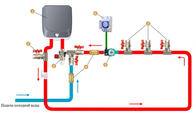 В случай, че горещата вода е необходима възможно най-бързо, тогава би било по-правилно да се използва система за рециркулация. Поради факта, че в системата се образува пръстеновидна тръба за охлаждаща течност. Постоянното движение на водата през него води до нагряване. Ето защо времето за изчакване на топла вода е сведено до минимум.