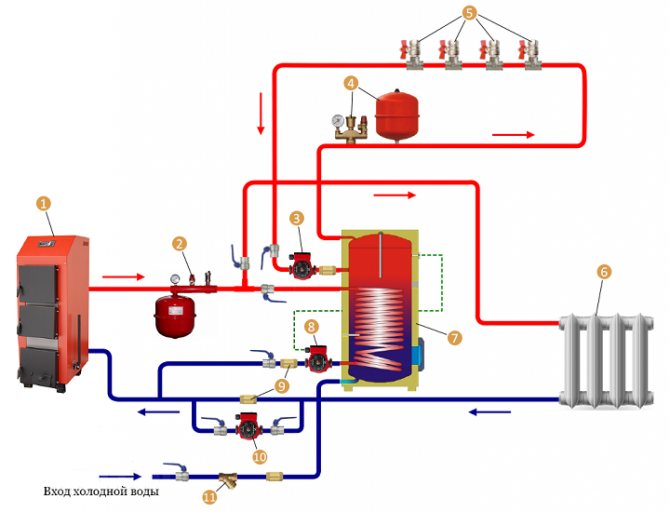 При изпълнението на тази схема веригата, която отива към бойлера, се прави с тръба с диаметър 1 стъпка по-голям от отоплителната. Именно това дава приоритет.
