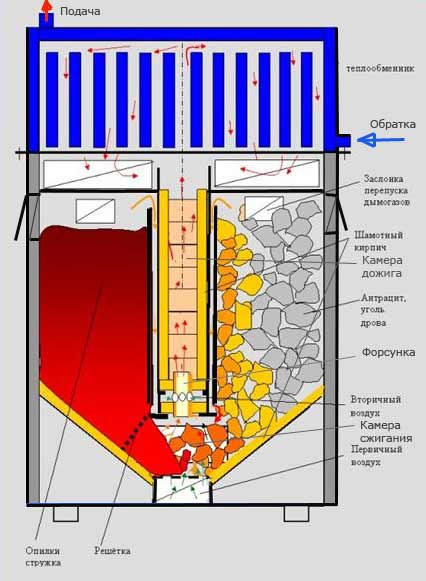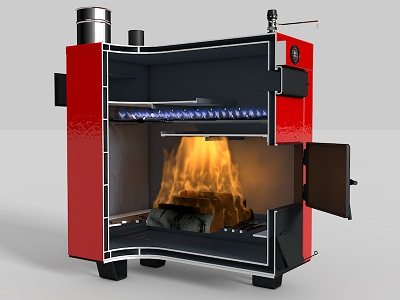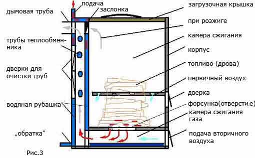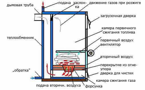 В горната камера за зареждане дърва за огрев тлеят само, отделяйки запалими вещества. След това горимите вещества се смесват с въздуха и чрез специална дюза се изпращат във втората, долна камера, където стават основното гориво за такъв котел. В процеса на изгаряне на смес от въздух и газове, отделени от дърва за огрев, е възможно да се постигнат достатъчно високи температури, поради което долната камера, в която се извършва процесът на горене, е обшита със специално топлоустойчиво покритие.