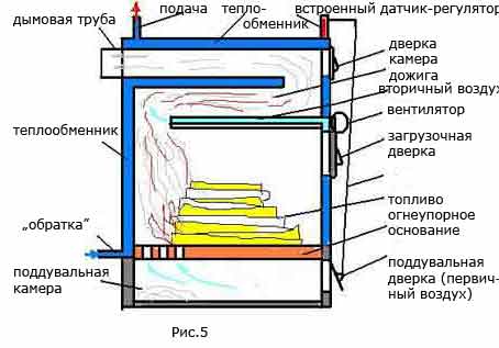 Камерата за зареждане и първично изгаряне на гориво по тази схема е разположена отдолу (фиг. 5). Основата му е направена от огнеупорен материал (например: шамотни тухли) с отвори за подаване на първичен въздух от взривната камера, които са разположени близо до задната стена на котела.Подаването на вторичен въздух за изгаряне на дървесен газ се извършва с помощта на вентилатор, монтиран на предната стена на котела, над вратата за зареждане.
