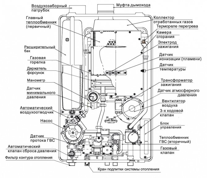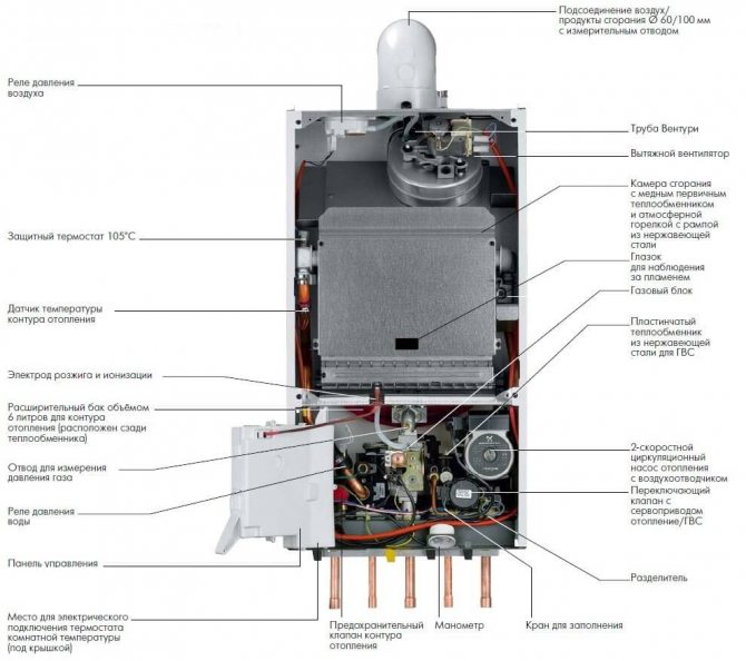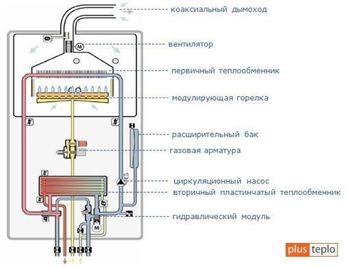 Въпреки "сходството" на името и схематичната подредба, такива двуконтурни котли не могат да бъдат наречени еднакви. При всички прилики има разлики. Една от ключовите разлики в дизайна на топлообменника на котела, който е предназначен да прехвърля топлината, получена по време на изгарянето на горивото, към охлаждащата течност. Топлообменникът обикновено се намира в горната част на котела, а газовата горелка е разположена под него. Топлината, генерирана по време на изгарянето на газ, издигайки се нагоре, се прехвърля в метален топлообменник, вътре в който тече топлоносител. Ролята на топлоносителя е преносът на топлинна енергия от топлообменника към отоплителните радиатори, разположени в цялата къща или апартамент.