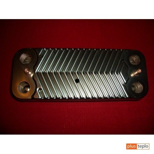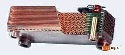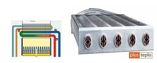 Първичен топлообменник, направен от медни тръби с медни плочи, споени върху тях. Основната функция на такъв първичен топлообменник е преносът на топлина от изгаряния в горелката газ към охлаждащата течност на отоплителната система.
