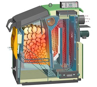 - В механизмите, работещи чрез директно изгаряне, процесът на пренос на топлина възниква по време на изгарянето на консуматива, което обяснява необходимостта от постоянно поддържане на горенето. При тези устройства разходът на гориво е висок, докато съотношението на производителност далеч не е идеално. Освен това тези котли не са автоматизирани.