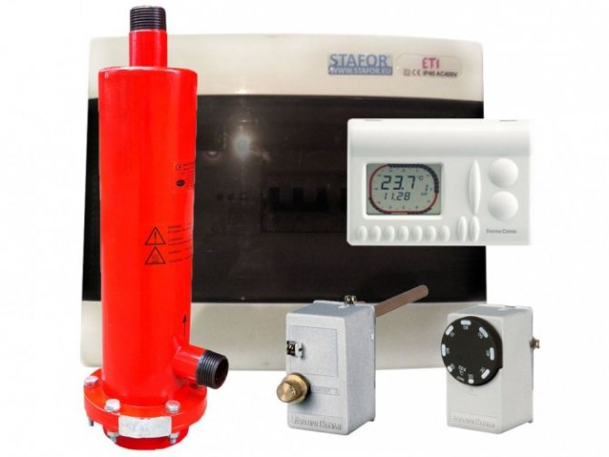Уредът може да работи със или без принудителна циркулация. Повишаването на водата в системата без помпа е от 3 до 24 метра (в зависимост от модификацията), поради голямата температурна разлика на входа и изхода на електрическата инсталация, което позволява отопление на едноетажни и нискоетажни помещения . Когато използвате помпа, консумацията на енергия се намалява. И за да се контролира работата на инсталацията, в комплекта е включен термостат, който измерва температурата на въздуха в помещението и включва / изключва EOU, поддържайки зададената температура. Нагревателният елемент не се повреди, дори ако захранването се подава към EOU и няма охлаждаща течност в системата за отопление на водата.