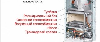 Основната конфигурация включва корпус, който включва и елементи на топлообменника. Отвън е покрита с топлоизолационен материал и корпус от стомана. Горелките са представени в размер на две парчета: едната е основната, а втората е запалителната. Пакетът включва газов канал и автоматичен газов клапан, който е отговорен за безопасността по време на работа.