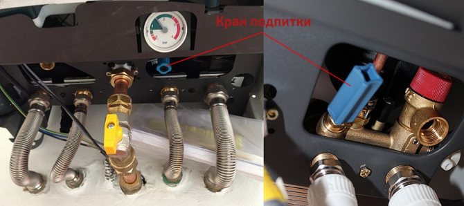 В корпуса на блока има специален клапан, разположен близо до разклонителната тръба, за подаване на охлаждащата течност към системата. По време на процеса на пълнене налягането в системата се следи, благодарение на наличието на сензори и манометри. Те вече са инсталирани в съвременните котли и не е необходимо да ги купувате допълнително. Когато уредът се напълни с вода, на сензора се издига знак. Когато достигне отметката от 1,5-2 атмосфери, подаването на вода се спира и по този начин пълненето е завършено.