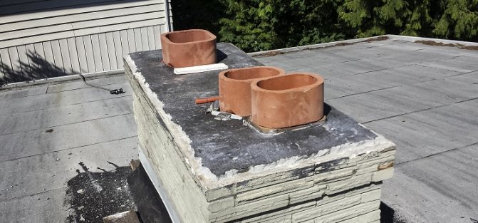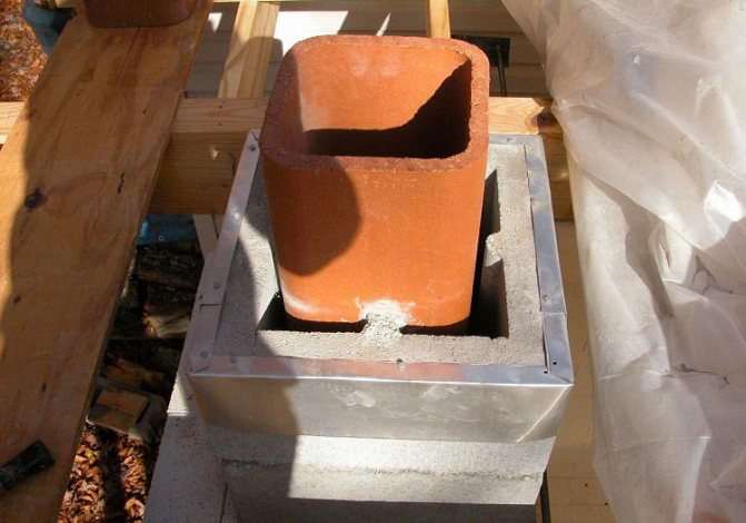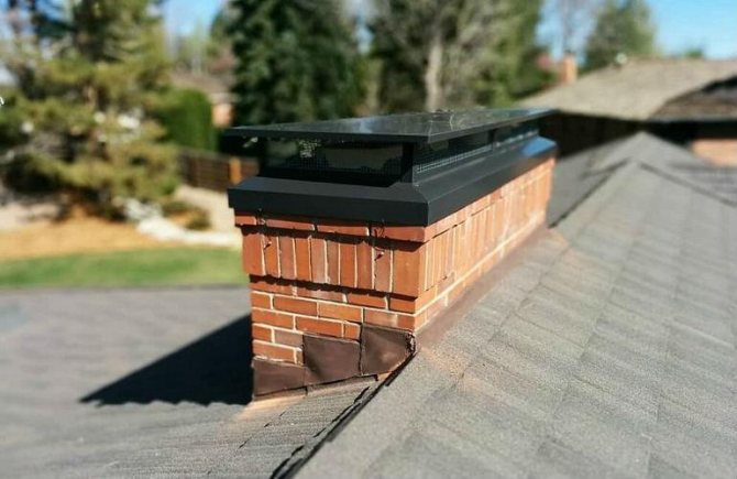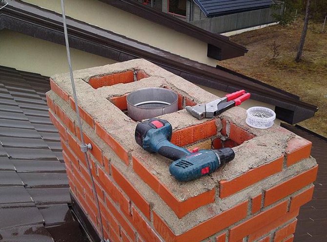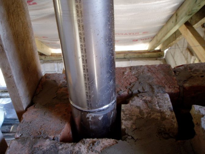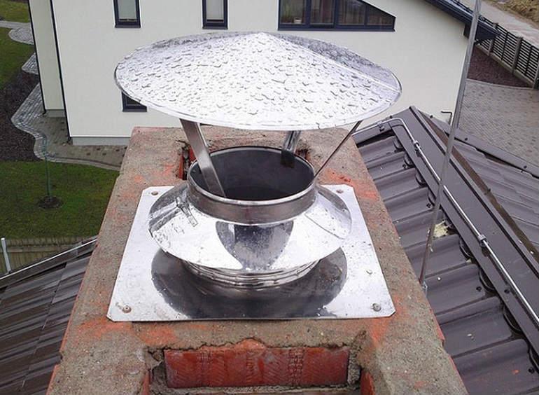 За да се монтира главата, върху повърхността на комина е изградена твърда втулка и около нея е монтирана покривна плоча. В близост до тръбата е прикрепена яка, за да се предотврати навлизането на кондензат в тухлената шахта. Частта на ръкава, стърчаща над покрива на къщата, е изолирана с изолация. Във височина тръбата трябва да излиза извън нивото на билото.
