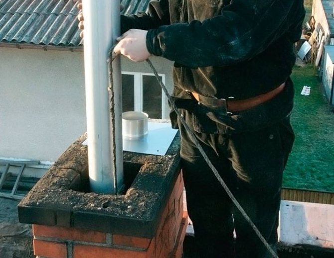 - Втулката е внимателно спусната по протежение на вала, докато спре до дъното. Ако дължината на комина е малка, лека тръба от неръждаема стомана се потапя на ръка, без да се използват кабели.