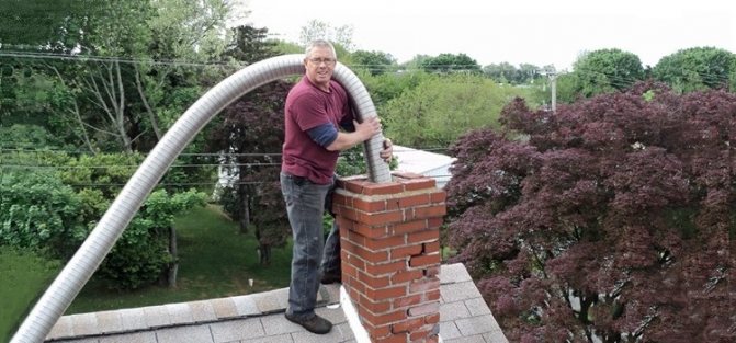 - Ако гофрирането се пуска навън през тухлен комин, монтажът се извършва отгоре. В същото време в долния край е завързано здраво въже. По този начин, работейки заедно, можете бързо и лесно да включите комина с гофриране. През устието на тръбата се подава гъвкав комин от неръждаема стомана, а вторият участник в процеса издърпва гофрирането отдолу.