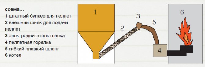 Основната задача на горелката е да организира мощна горелка, която да загрява котела. За същото се използва горелка за пелети и се състои от малка горивна камера под формата на аеродинамичен тунел. Пелети се подават в него от бункера. От въздушния поток се генерира насочен пламък. Горивната камера е направена правоъгълна или кръгла. Външната част се състои от винтов транспортьор. Горивото от бункера се подава през входящата тръба. Следващият незаменим елемент е вентилаторът. Той ще подава въздух към дъното на камерата.