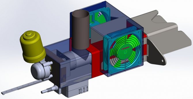За да завъртите механизма, се нуждаете от лагери, нискоскоростен мотор (електрически) и скоростна кутия. Вентилаторът може да бъде закупен в магазина. Той е фиксиран върху пластмасата, в която мястото вече е подготвено. Плочата е направена въз основа на чертежа. Конфигурацията зависи от самата врата на котела. Чертеж на горелката може да се види на тази снимка.