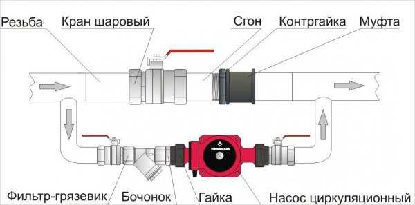Снимка 1. Схема на монтаж на циркулационна помпа в отоплителната система. За да го инсталирате, ще ви трябват много компоненти.