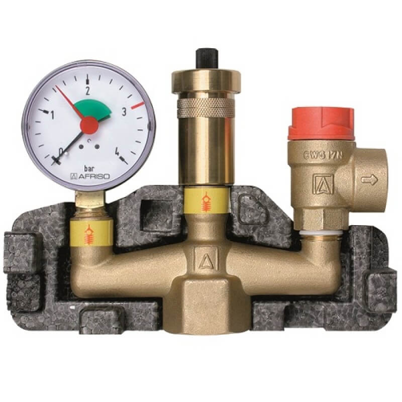 - манометър, автоматичен обезвъздушител и предпазен клапан;