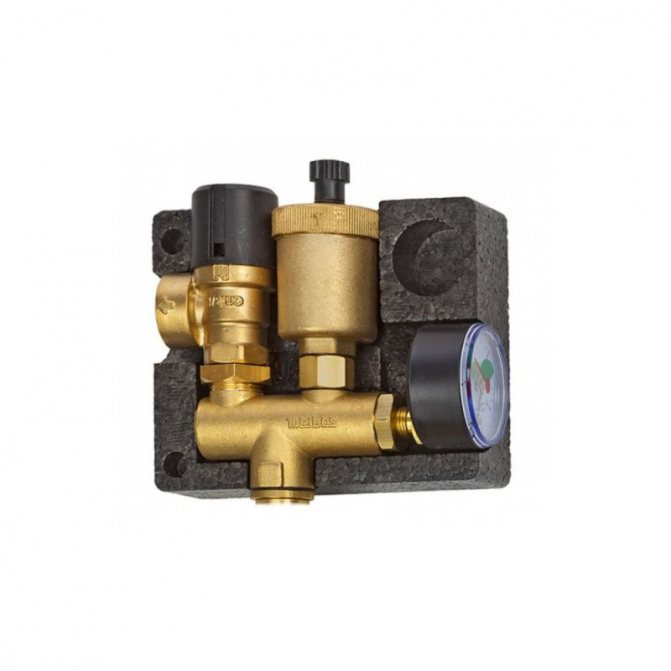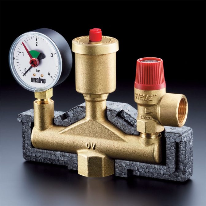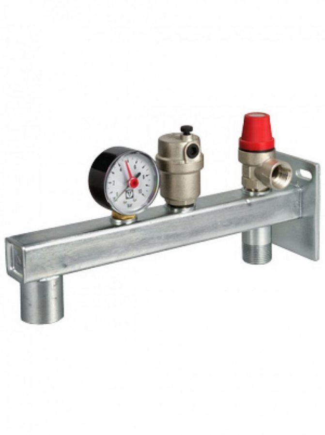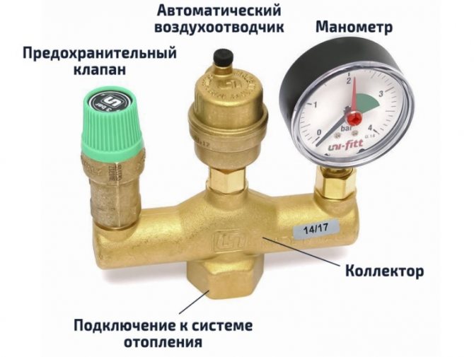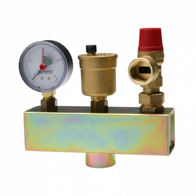 Дизайнът се състои от следните елементи: предпазен клапан, манометър и автоматичен обезвъздушител. Всички тези устройства се намират в метален корпус с резбови връзки.