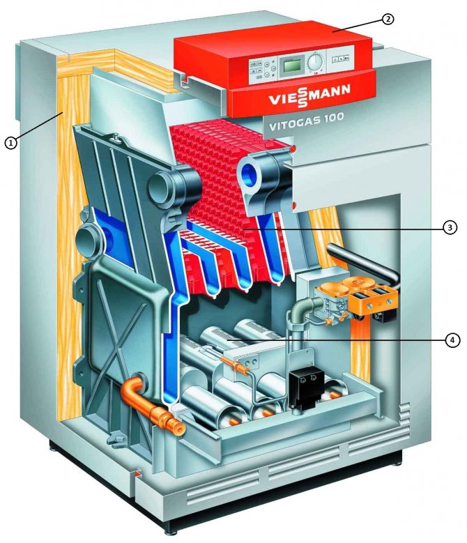 Изграждането на подов газов котел по примера на Viessmann Vitogas 100-F. 1 - високоефективна топлоизолация, 2 - топлообменни повърхности от специален сив чугун, 3 - горелка от неръждаема стомана с частично предварително смесване, 4 - цифров контролер на котела